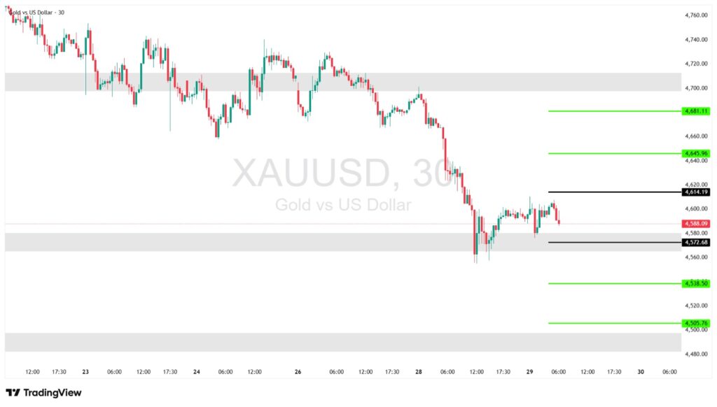 تراجع سعر الذهب دون مستوى 4600 دولار للأونصة، بعد انخفاض ملحوظ في الجلسة السابقة.