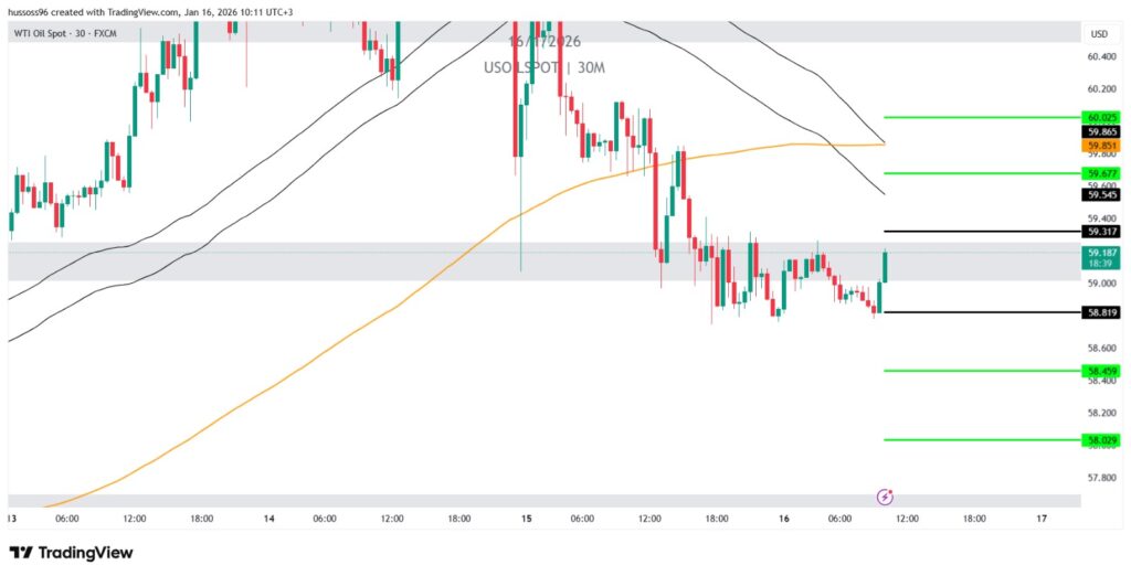 ملاحظة: النفط يحاول التماسك بعد هبوط قوي، لكن الثبات أسفل 59.31 يبقي النظرة السلبية قائمة.