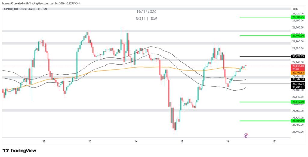 ملاحظة: السعر يحاول الاستقرار أعلى المتوسطات بعد ارتداد قوي، والاختراق أعلى 25,873 يعزز استمرار التصحيح الصاعد.