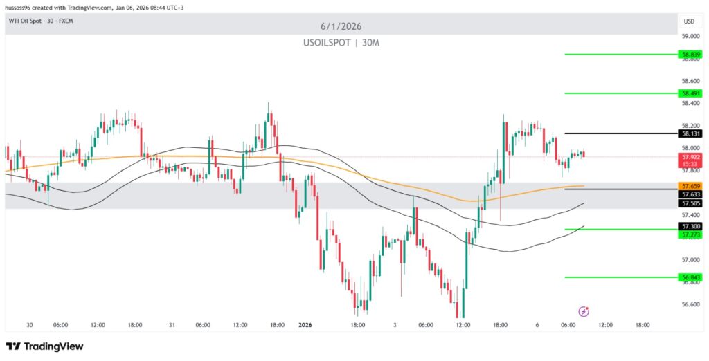 ملاحظة: النفط يحاول تثبيت الصعود بعد انعكاس حاد، لكن المنطقة حول 58.13 تمثل مقاومة مفصلية.