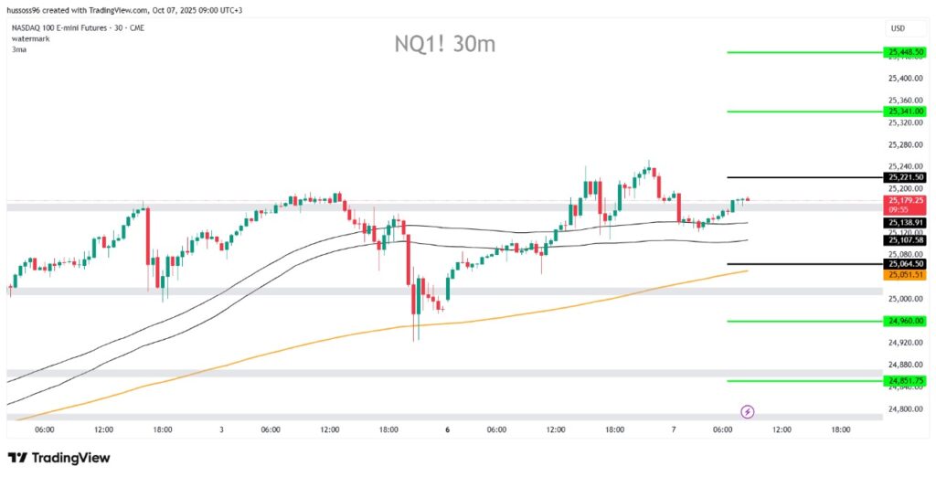 Scenario 1: Buy Nasdaq with a breakout and hold above 25,221, targeting 25,341 and then 25,448.