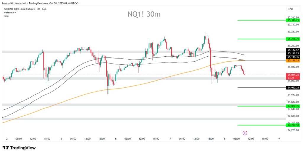 Scenario 1: Sell Nasdaq with a break and hold below 25,000, targeting 24,962 and then 24,857.