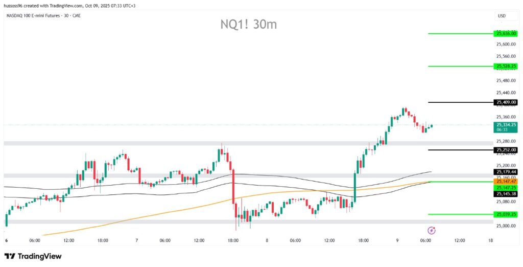 Scenario 1: Buy Nasdaq with a breakout and hold above 25,409, targeting 25,528 and then 25,636.
