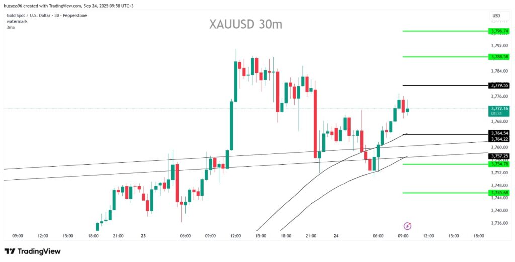 Scenario 1: Buy gold with a breakout and stability above 3,779.55, targeting 3,788.58 and then 3,796.74.