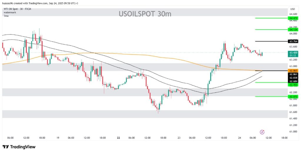 Scenario 1: Buy oil with a breakout and stability above 63.764, targeting 64.124 and then 64.472.