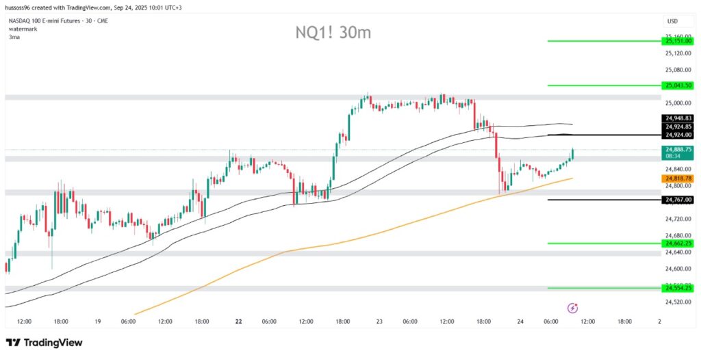 Scenario 1: Buy Nasdaq with a breakout and hold above 24,924, targeting 25,043 and then 25,151.