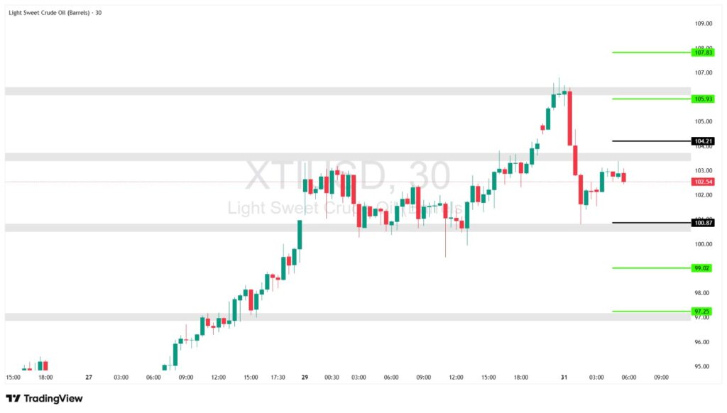 - Note: West Texas Intermediate has experienced a sharp decline from its recent peak, with the market currently undergoing a corrective phase within a broader downtrend.