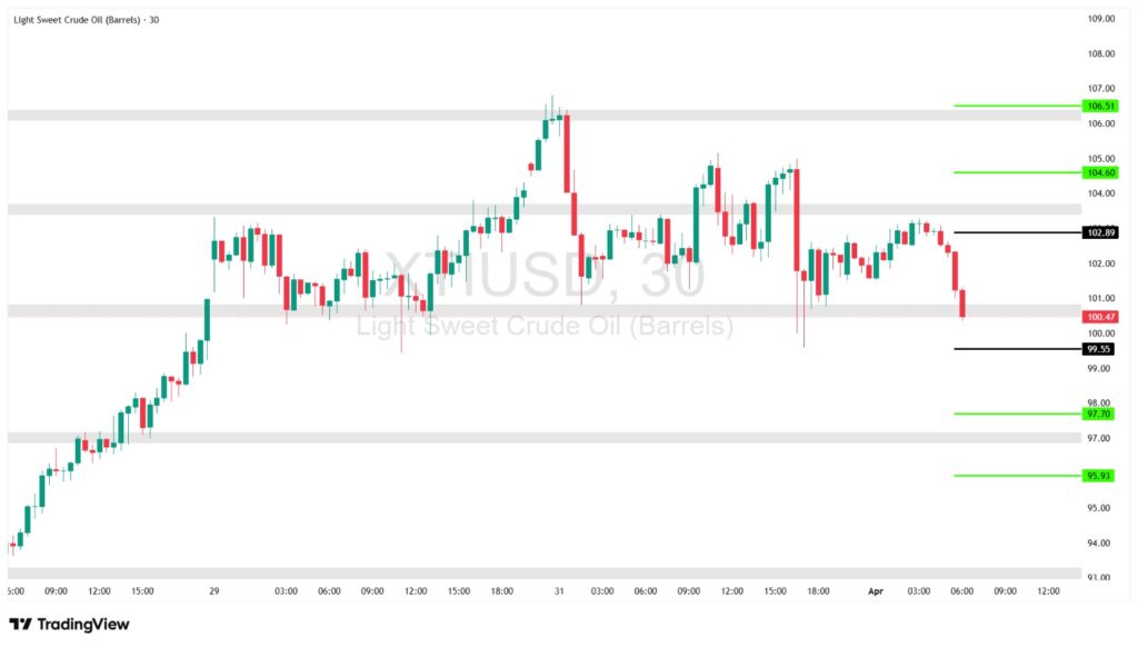 - Note: Oil is currently under downside pressure following a strong breakdown. Any upward movement is considered corrective unless the price decisively breaks above 102.89